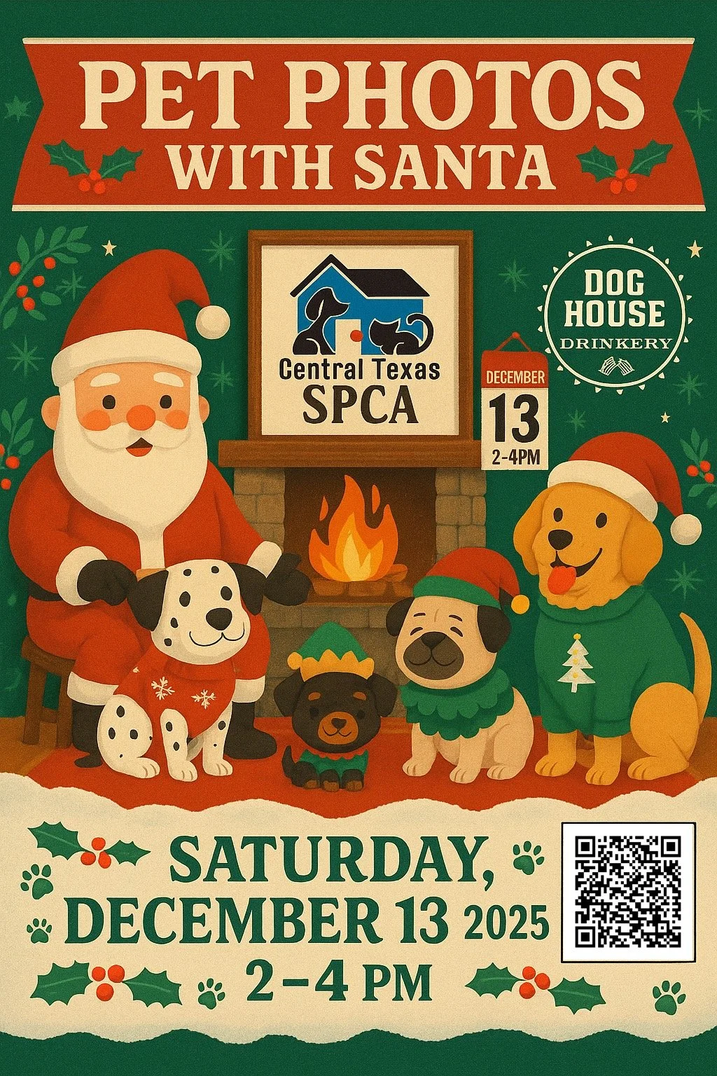 Professional photos of your puppers with Santa on Saturday, December 13th Doghouse Drinkery & Dog Park with all proceeds from the photo donations going to Central Texas SPCA !! An amazing dog park, vendors with giveaways, silent auction items, holiday cheer, and adorably staged photos of your dog with Santa! SAVE THE DATE, more information to come!